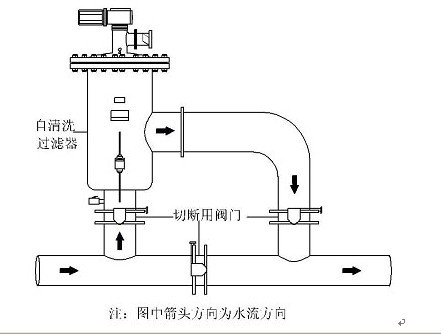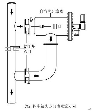 (6)安裝時應(yīng)考慮便于檢修,自清洗過濾器前后應(yīng)安裝關(guān)斷閥門,且應(yīng)安裝旁通管道。